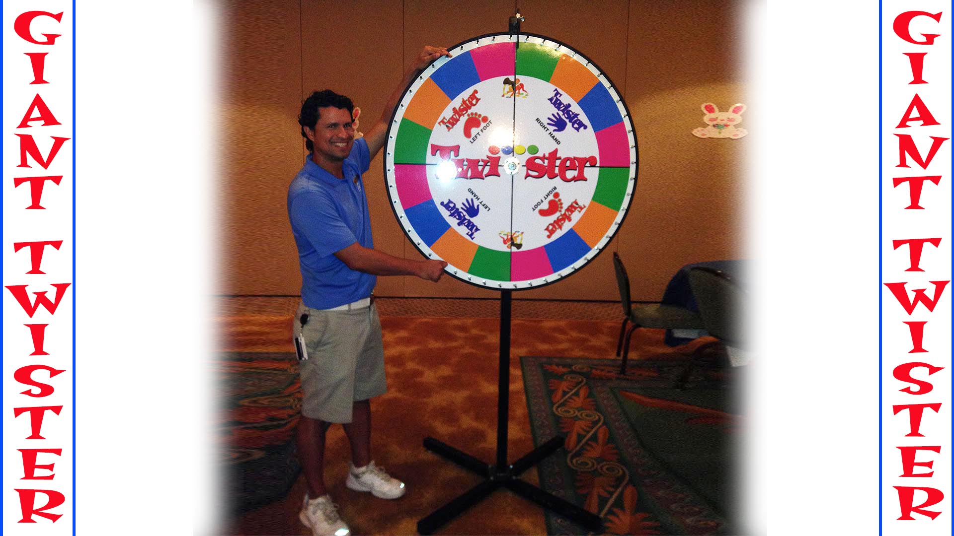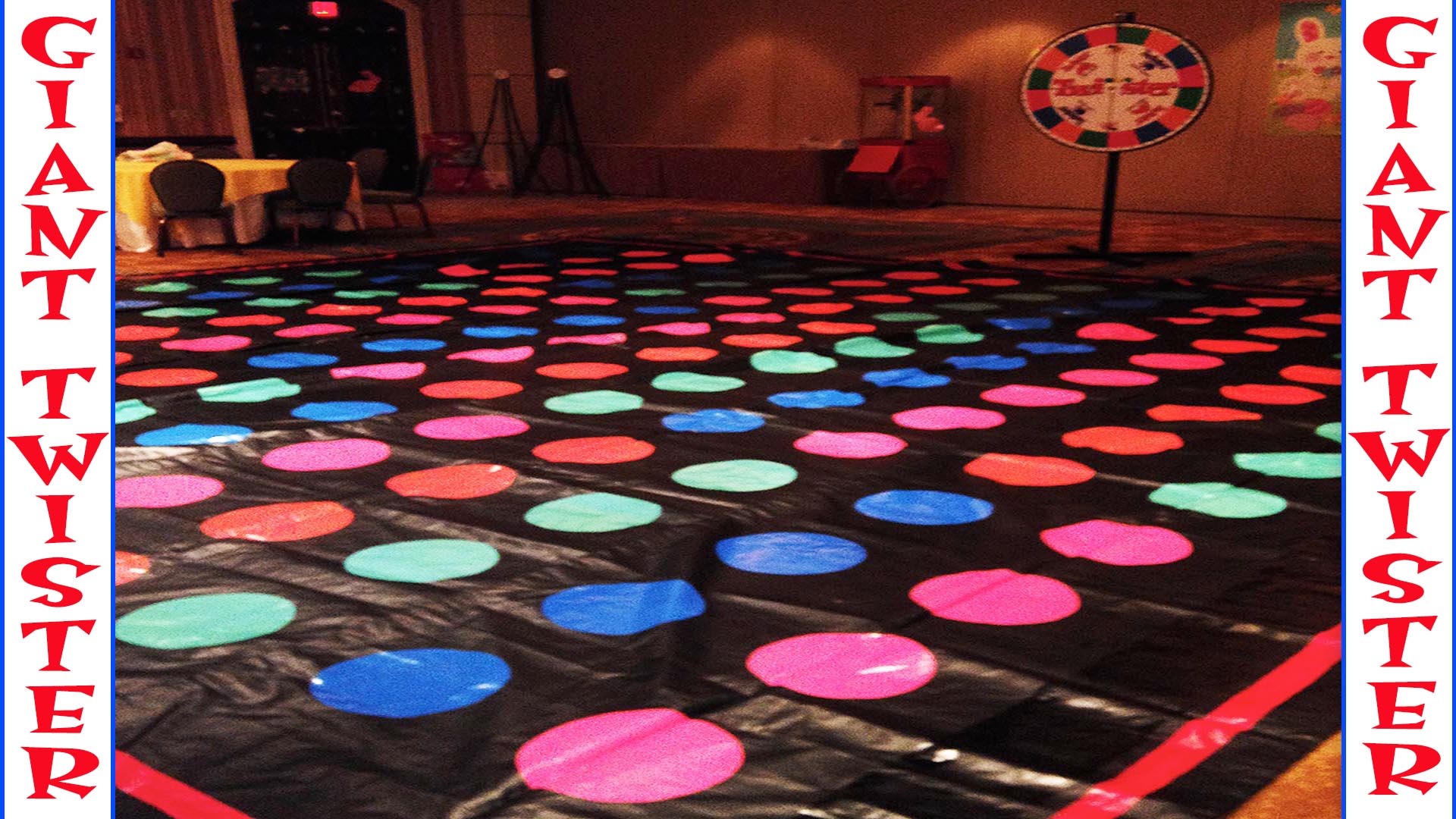 Florida’s Largest Twister Mat Is Big Enough To Cover Most Dance Floors At 25’X25′. This Heavy Duty Twister Mat Can Accomodate Up To 75 Guests, But It Can Be Adjusted To Smaller Sizes.Our 42″ Giant Twister Wheel is a giant version of the original Twister Wheel. Dimensions 25’L X 25’W (But Can Be Made Smaller). Dimensions up to 25’W x 25’L